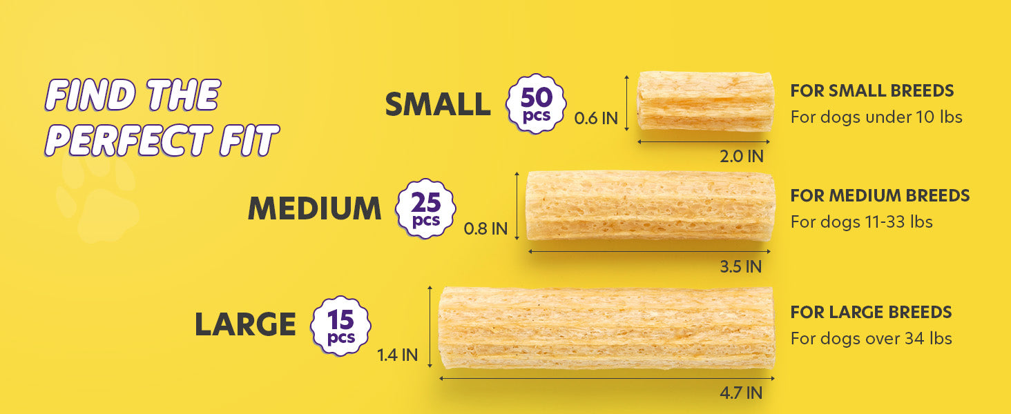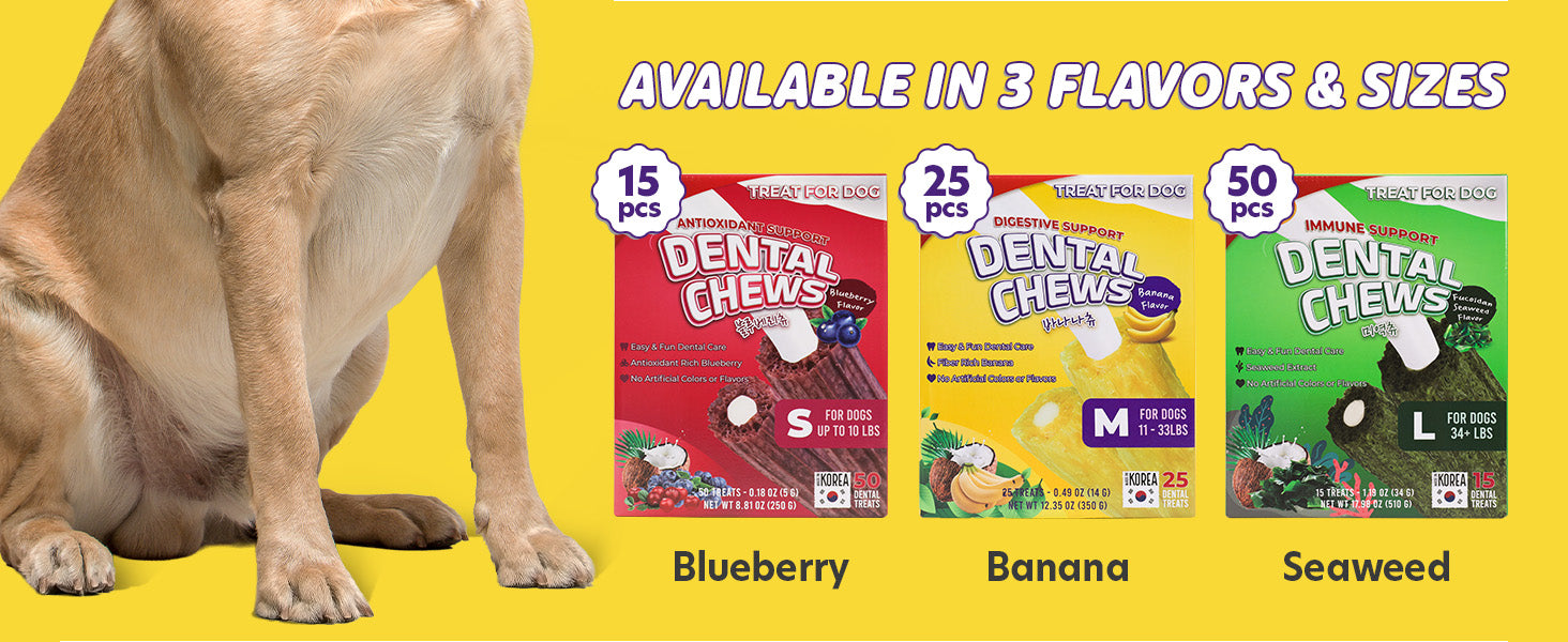 - VARIETY OF SIZES & FLAVORS: Super Pawbulous dog dental treats are available in 3 sizes. Bite Size (2.0 in) for small dogs up to 10 lbs, Medium Size (3.5 in) for dogs 11–33 lbs, and Large Size (4.7 in) for dogs 34 lbs and up. Choose your dental dog treats from Banana, Blueberry, or Seaweed, there’s a dental treats made just for them.