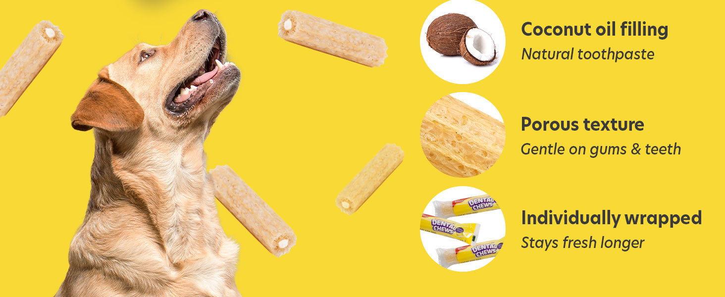 - COCONUT OIL FILLING FOR CLEANER TEETH: Each dental chews for dogs features a smooth coconut oil filling that helps reduce plaque buildup, this dog chews for teeth cleaning helps reduce gum bleeding and freshen breath with every chew. The bubbly texture encourages natural chewing action to gently remove plaque and tartar, supporting clean teeth and healthy gums promoting oral hygiene. An ideal teeth cleaner for dogs while enjoying a treat.