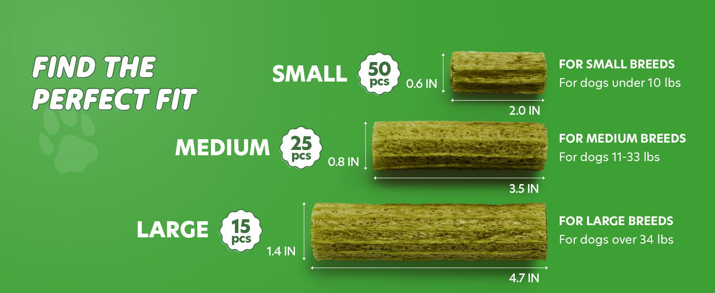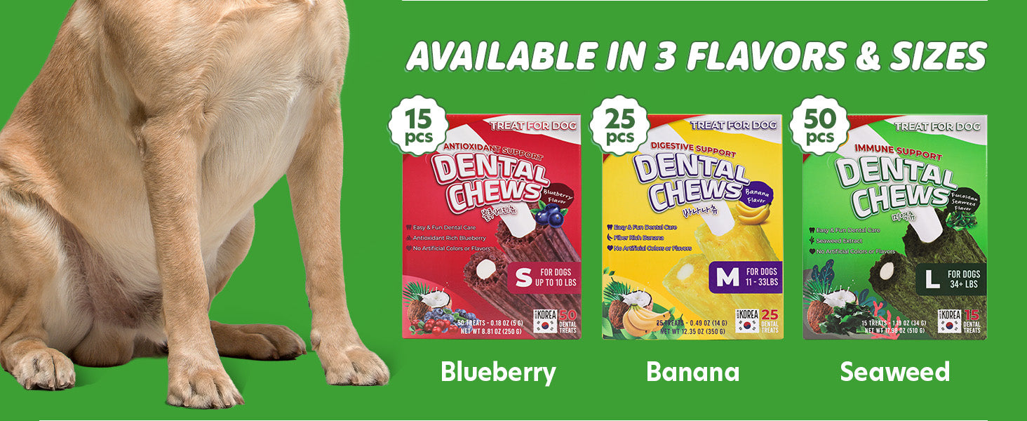 - VARIETY OF SIZES & FLAVORS: Super Pawbulous dog dental treats are available in 3 sizes. Bite Size (2.0 in) for small dogs up to 10 lbs, Medium Size (3.5 in) for dogs 11–33 lbs, and Large Size (4.7 in) for dogs 34 lbs and up. Choose your dental dog treats from Banana, Blueberry, or Seaweed, there’s a dental treats made just for them.