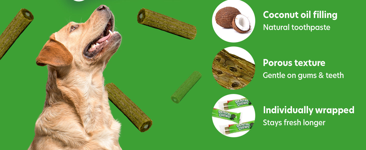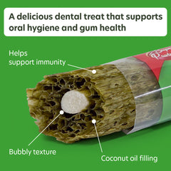 - COCONUT OIL FILLING FOR CLEANER TEETH: Each dental chews for dogs features a smooth coconut oil filling that helps reduce plaque buildup, this dog chews for teeth cleaning helps reduce gum bleeding and freshen breath with every chew. The bubbly texture encourages natural chewing action to gently remove plaque and tartar, supporting clean teeth and healthy gums promoting oral hygiene. An ideal teeth cleaner for dogs while enjoying a treat.