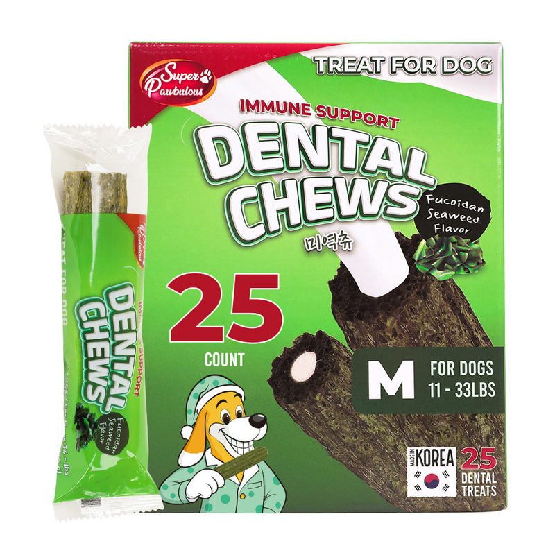 - IMMUNE SUPPORT WITH SEAWEED EXTRACT: Made with fucoidan seaweed extract, this dog dental chew flavored treat supports your dog’s natural defenses and overall vitality. A nutrient-rich dental treats for dogs for daily dental care and a healthy immune. This medium size comes in 25 treats that is perfect for for dogs 11–33 lbs.